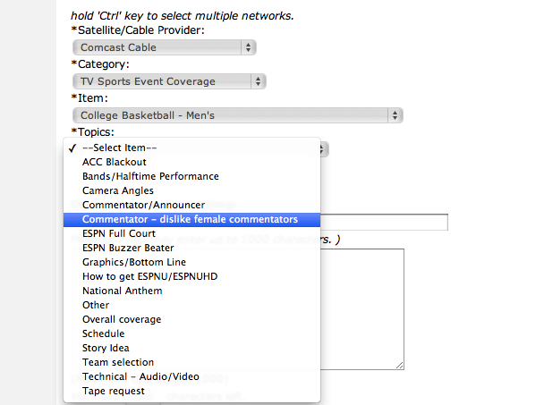 This screen shot is apparently from a complaint form on ESPN USA.