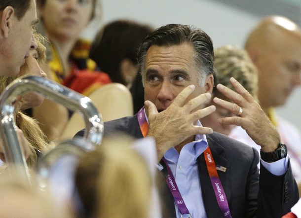 Mitt Romney describes to a group of Olympic spectators how the gaffes just keep on tumbling out of his mouth. Image: AP Photo/Michael Sohn.