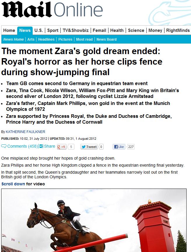 The GB eventing team picked up a silver medal yesterday afternoon, but don’t imagine for a second that the British media were caught being happy about it. Within seconds of the results coming in, a certain mid-market daily had modified an existing story to describe Zara Phillips’ ‘horror’ at clipping a fence during her showjumping round, and cheerily implying it was her fault the team missed out on the Gold.