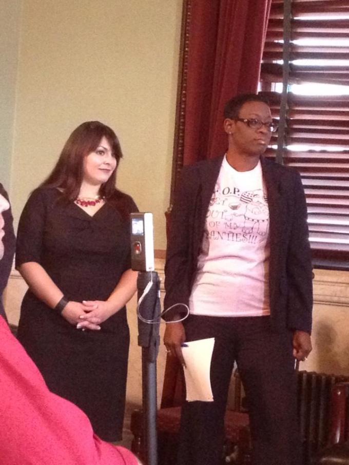 The woman on the right in this photograph is Nina Turner, a Democratic State Senator in Ohio. She responded to a Republican Party attempt to de-fund Planned Parenthood by wearing a t-shirt suggesting the acronym ‘GOP’ actually stands for “Get Out of my Panties“, not “Grand Old Party”, as the Republicans would have it.