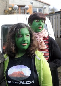 Two people with her faces painted in green walk in the streets of the French southwestern village of Bugarach, on December 21, 2012, near the 1,231 meter high peak of Bugarach – one of the few places on Earth some believe will be spared when the world allegedly ends today according to claims regarding the ancient Mayan calendar. French authorities have pleaded with New Age fanatics, sightseers and media crews not to converge on the tiny village. AFP PHOTO / ERIC CABANIS (Photo credit should read ERIC CABANIS/AFP/Getty Images)
