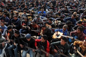 Musicians play John Lennon’s “Imagine” in a memorial tribute to the 23-year old Indian gang rape victim, during a mass guitar ensemble played by some 600 guitarists in Darjeeling on January 3, 2013. Protesters have massed in Indian cities daily since the December 16 assault demanding the government and police take sex crime more seriously, with tougher penalties for offenders and even chemical castration being considered. Five men accused of gang-raping a 23-year-old student on a moving bus in New Delhi in a deadly crime that repulsed the nation are to be formally charged in court January 3. AFP PHOTO/Diptendu DUTTA (Photo credit should read DIPTENDU DUTTA/AFP/Getty Images)