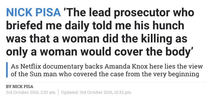 In this specific case, the inaccuracies of media reports, assumptions made by law enforcement, public pressure and general ineptitude on the part of the department tasked with examining the scene, caused Meredith’s family untold suffering and two people to be convicted of a crime forensic evidence states it would have been impossible for them to commit. These assumptions, as articulated by prosecutor Giuliano Mignini himself in the Netflix documentary ‘Amanda Knox’ and recorded by the heroic Daily Mail reporter Nick Pisa (above) served to prejudice the case from the start and conclude in the harrowing mess we now know off by heart.
