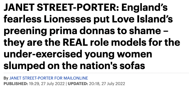 Already elements of the press are starting to follow a predictable narrative. The Daily Mail has already begun comparing female contestants of Love Island unfavourably with the Lionesses. THIS woman *points to an image of a woman in a football kit* is superior to THIS woman *points to an image of a woman in a swimsuit*.