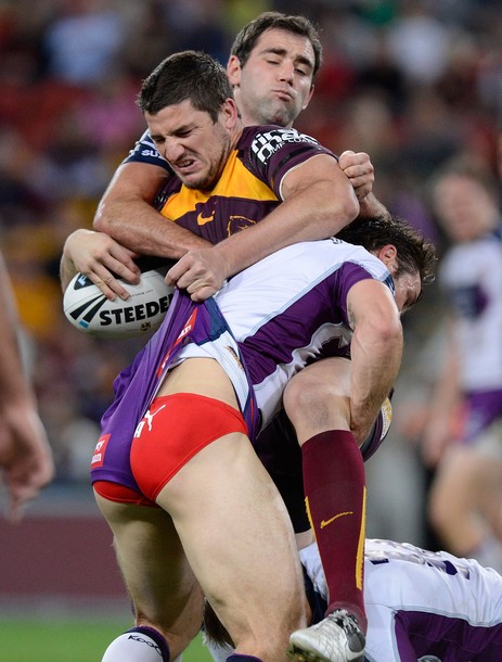 I hope this is a direct result of the NRL introducing elastane into the composition of player shorts this season. Otherwise this photo will be used as evidence in the first criminal trial involving a bloke actually being sliced in half during a sports game – a bisecting wedgie, if you will.